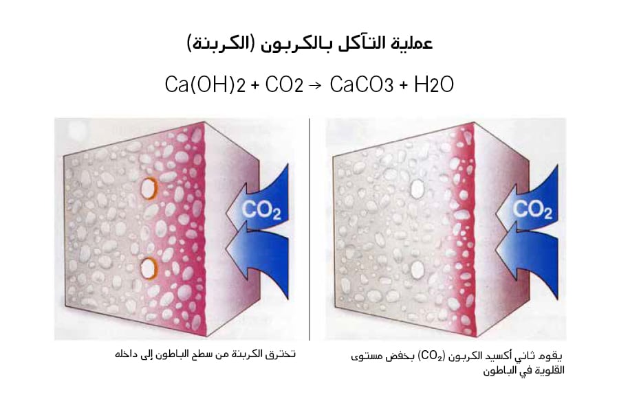 عملية تبدأ بتفاعل CO2 (ثاني أكسيد الكربون) مع الباطون، ما يؤدّي إلى انخفاض قاعديته. يبدأ التآكل من سطح الباطون ويتغلغل إلى داخله، ما يسبب عملية تآكل معدني. التآكل المعدني يؤدي إلى تكوّن الصدأ، وبالتالي إلى تشقق الباطون وانتفاخه وتفكّكه. يتطور التآكل بالكربون بسرعة عندما تكون نسبة الرطوبة بين 70%-90%. وبما أن معظم مناطق إسرائيل تتميز بمستوى رطوبة ضمن هذا النطاق، فهي عرضة للتآكل بالكربون بجميع عملياته.