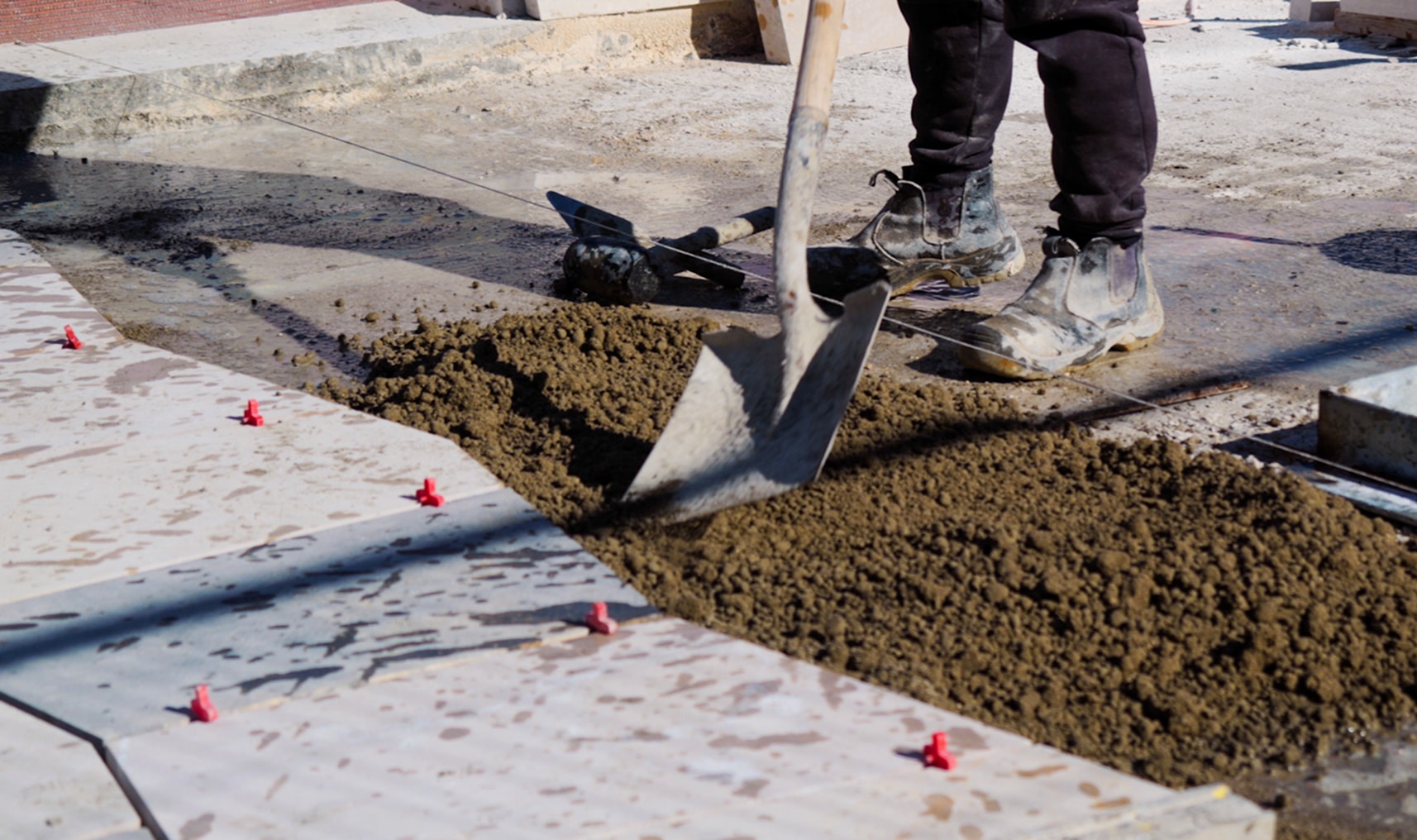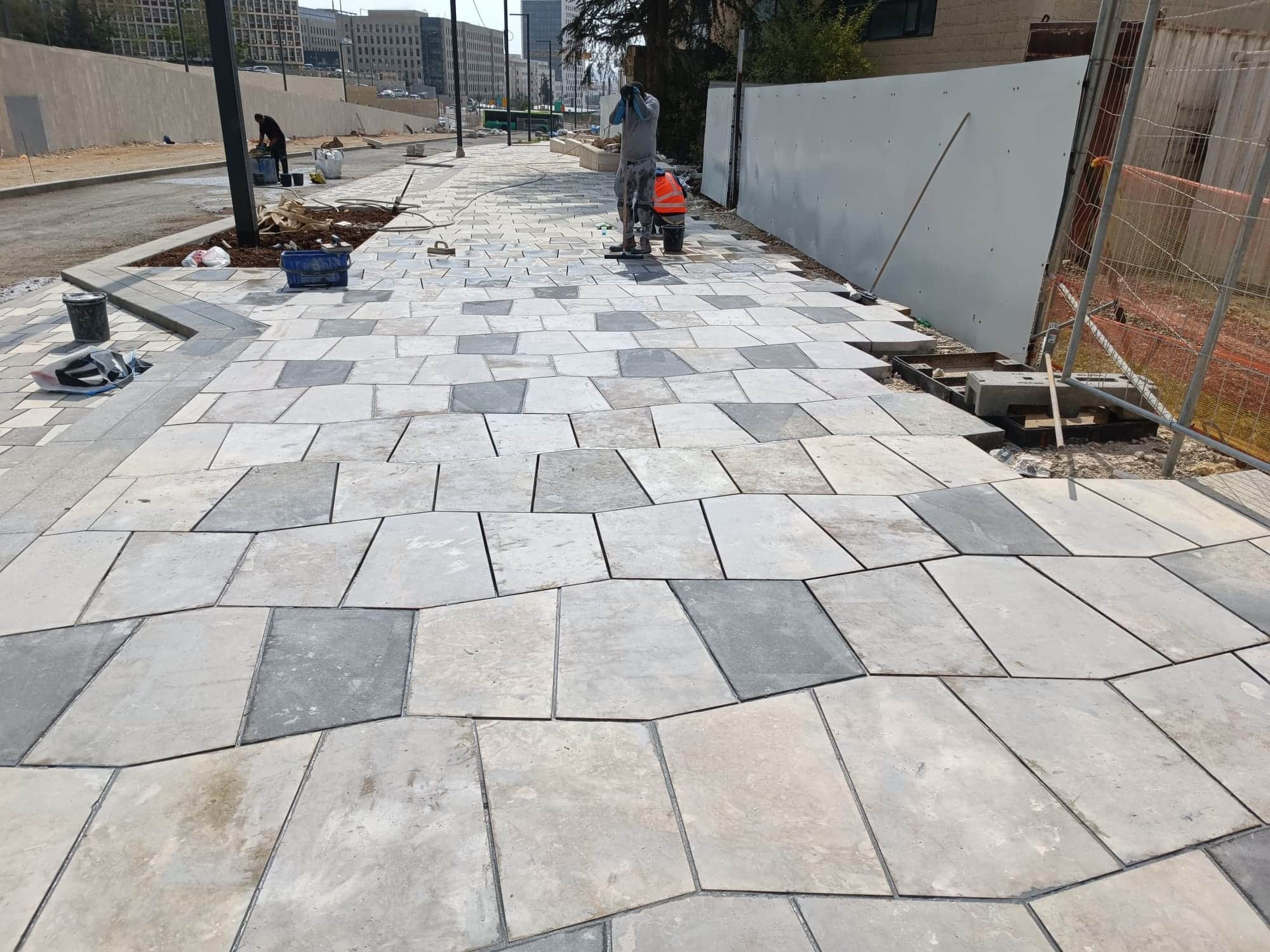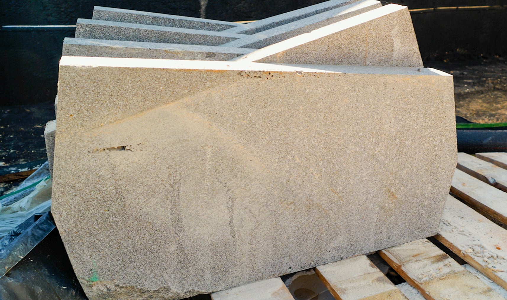 האבן הייחודית שמשקלה גבוה והמרקם שלה סופח מים הציב אתגר בפני המתכננים, להתאים חומרי הדבקה ומילוי מישקים שיתנו מענה לתכונות הייחודיות של האבן, בתנאי מזג האוויר.